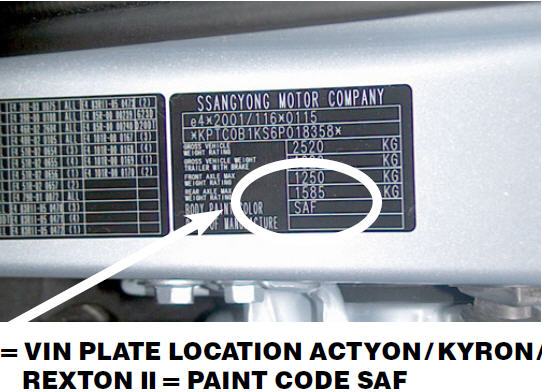 Автовиробники розміщують необхідну інформацію на спеціальних табличках VIN-Plate. На них можна дізнатися дані про виробника авто, VIN-код, вагові характеристики, а також код кольору фарби кузова SsangYong. Також код фарби вказаний у сервісній книжці на авто (якщо вона є).