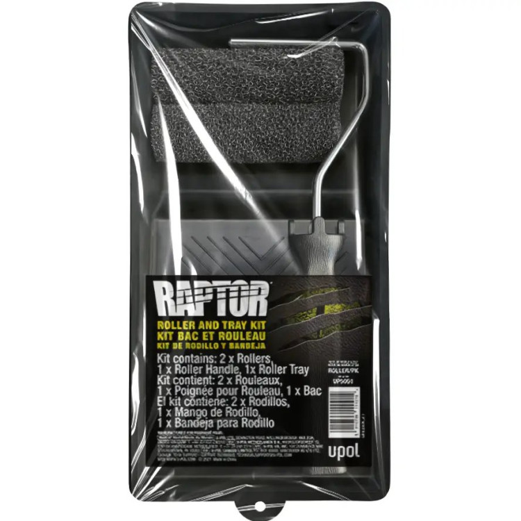Професійний набір для нанесення захисних покриттів RAPTOR - незамінний інструмент для рівномірного розподілу антигравію, захисних мастик та поліуретанових покриттів на великих площах. Комплект включає пластиковий поддон і два спеціалізовані валики різної довжини ворсу для роботи з різними типами поверхонь.