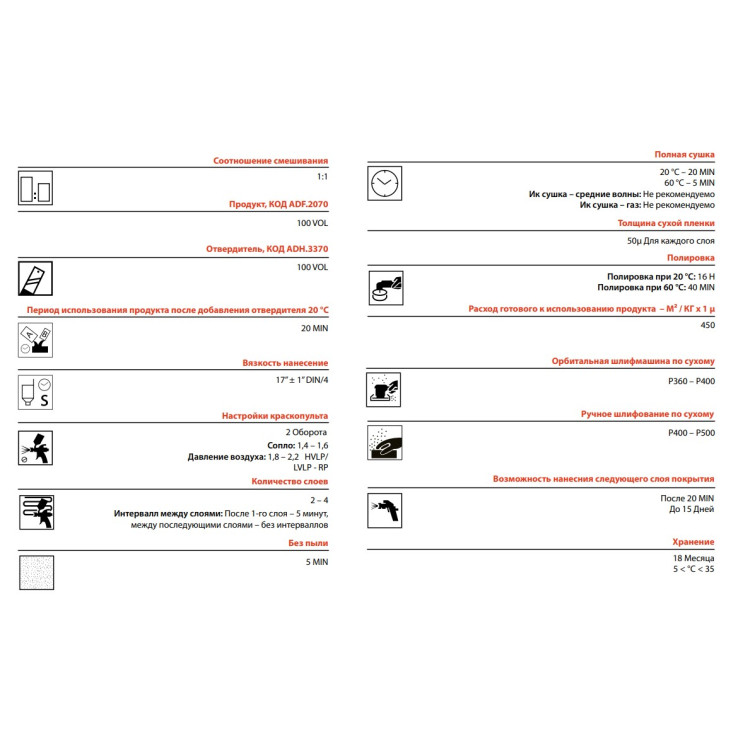 - Дуже гнучкий в аспекті подальшого нанесення емалей: від 20-30 хвилин до 15 днів (20°C) після нанесення продукту.