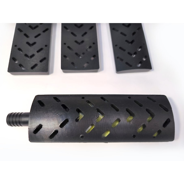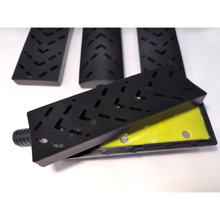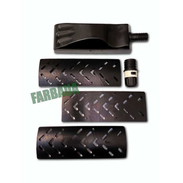 Набор подходит для шлифования выпуклых и вогнутых поверхностей. Изготовлен из качественных материалов с выверенной геометрией. Блок очень легкий и имеет нескользящую ручку с удобным хватом. В комплекте имеется адаптер шланга отвода пыли: 20/28 мм для подключения различных пылесосов (Mirka, Rupes, Festool).