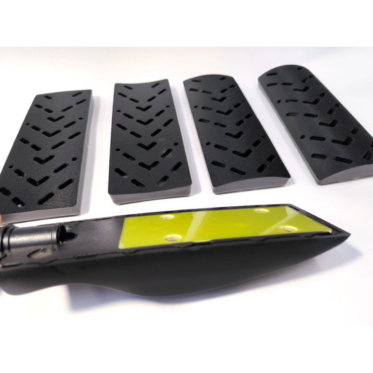 Шлифовальный лист крепится к подошве с помощью липучки. В комплекте 4 подошвы на магнитном креплении с различной конфигурацией дна: плоская, вогнутая, выпуклая (2 шт. с разным радиусом).