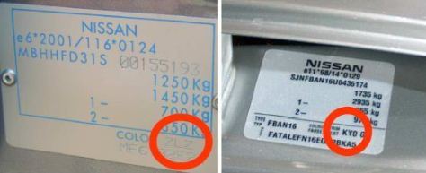 Так выглядит этикетка Vin Plate автомобилей Nissan где находится номер краски (красным цветом выделен код краски, слева код краски ZLZ, справа KY0):