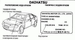 Автопроизводители размещают необходимую информацию на специальных табличках VIN-Plate. На них можно узнать данные о: производителе авто, VIN-код, весовые характеристики, а также код цвета краски кузова Daihatsu.