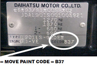 Так примерно выглядит этикетка Vin Plate автомобилей Daihatsu где находится номер краски (код обведен овалом - B37).