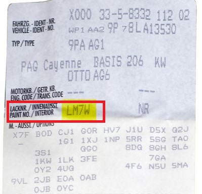 Так примерно выглядит этикетка Vin Plate автомобилей Porsche где находится номер (код) краски (код отмечен красным цветом). Код краски состоит либо из четырех цифр и начинается с буквы L, или из трех цифр - он будет содержать буквы и/или цифры: