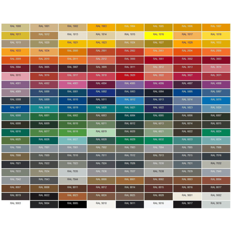 Цвет можно выбрать из RAL каталога, который приведен на фото*, или каталога автоэмалей Mobihel**, также возможно изготовление пигмента по коду краски вашего авто.