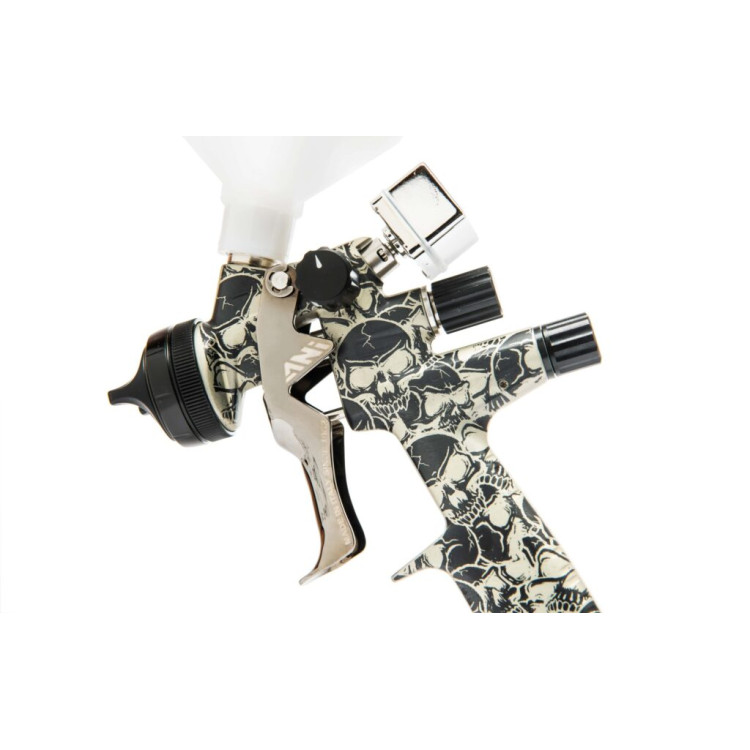 ANI SKULL TMD1 1/4MG 1.3 мм - первый в мире профессиональный цифровой краскопульт с системой смены воздушных головок (WB - CLEAR - HVLP), регулируя давление воздуха и вентилятор в соответствии с используемой воздушной крышкой. ANI SKULL TMD1 работает как обычный краскопульт, но простым жестом можно изменить режим окраски, оптимизируя работу и снижая затраты.