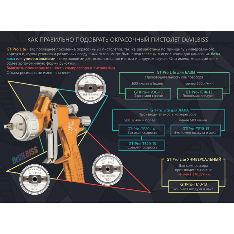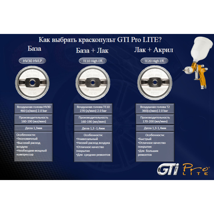DeVilbiss GTi Pro Lite - серия краскопультов нового поколения, которая пришла на замену серии DeVilbiss GTi Pro. Как и в предыдущей линейке универсальная конструкция краскопульта позволяет использовать его с несколькими воздушными головами.