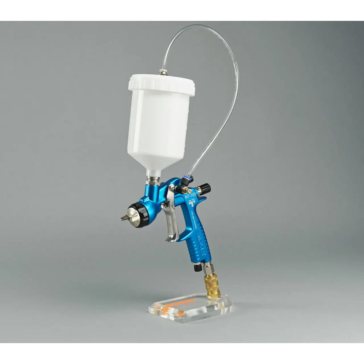 One Tech NT-103 - покрасочный пистолет с верхним бачком и регулируемым дополнительным давлением в бачок для густого материала. Давление на материал в бачке создается с помощью подачи сжатого воздуха от специального выхода в краскопульте. Внутреннее давление в бачке настраивается с помощью регулятора.