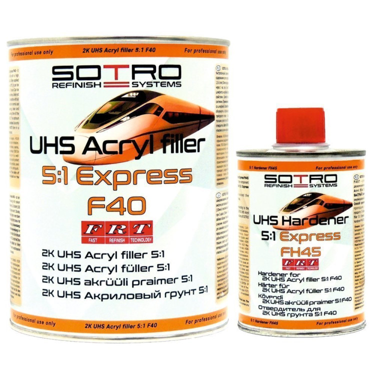 Sotro Acryl filler 5:1 Express F40 UHS - это быстросохнущий акриловый грунт, с очень высоким содержанием сухого остатка. Быстро сохнет, легко шлифуется, не забивает абразив. Обладает хорошими заполняющими свойствами. Совместим со всеми современными лакокрасочными системами. При нанесении в 1,5-2 слоя (100мкм) и воздушной сушке при + 25°C можно обрабатывать через 1 час, при 3 слоях (150мкм) - 2 часа.