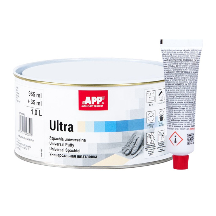 APP Ultra - легкая двухкомпонентная полиэстровая заполняющая шпатлевка. После отвердевания устойчива к воздействию растворителей, кислот, щелочей и соляных растворов невысокой концентрации. Шпатлевка AРР ULTRA характеризуется высокой эластичностью, механической и термической стойкостью, легко накладывается и обрабатывается.