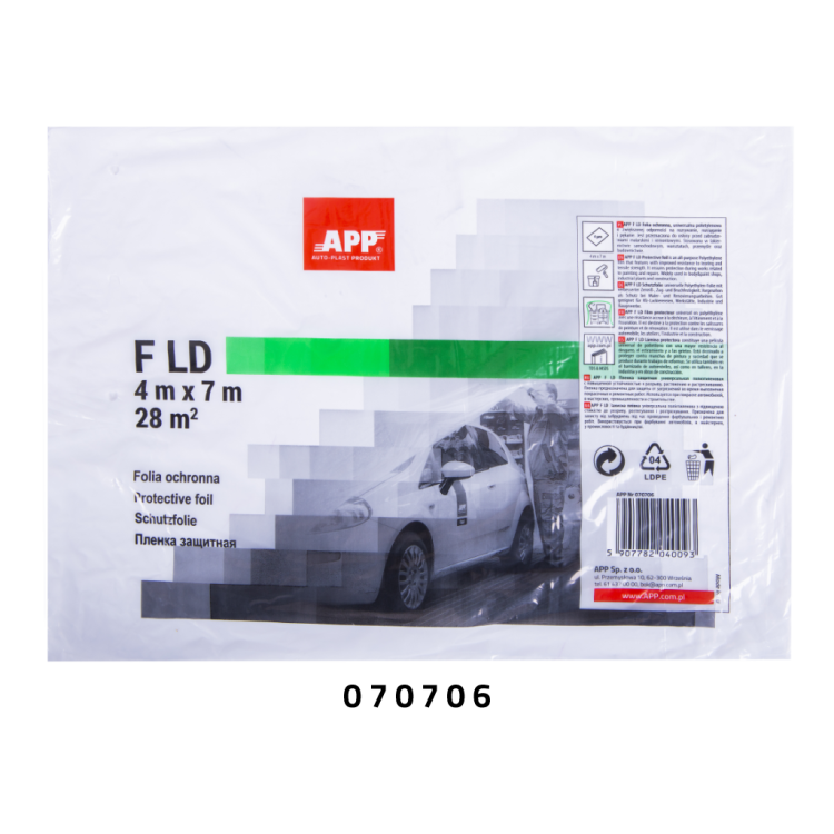 APP F LD (070706) является универсальной полиэтиленовой пленкой высокой плотности (PE HDPE) толщиной 4мкм и размером 4 х 7м (28 м2). Пленка имеет повышенную устойчивость к разрывам, растягиванию и трещинам. Предназначена для защиты от загрязнений во время покраски и ремонта в мастерских на сервисных центрах, заводских цехах, офисах, квартирах а также для защиты различного рода предметов, устройствах, автомобилях и мебели.