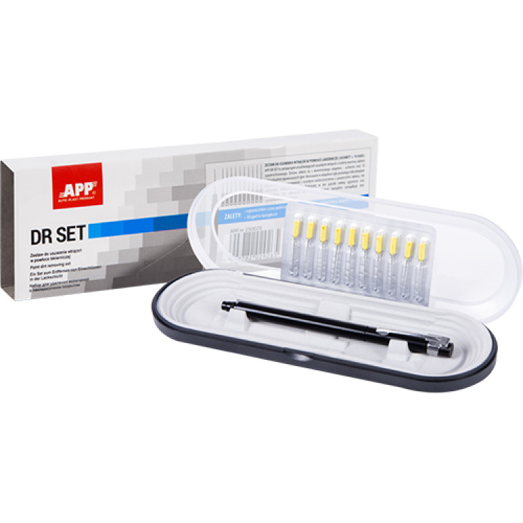APP DR SET - набор из 10 иголок с алюминиевым держателем. Закрепляемые в адаптере иглы имеют микроскопические крючки, облегчающие зацепление и удаление загрязнений с поверхности лака, не оставляя видимых следов. Выполняемая таким образом операция, сокращает время полирования либо необходимость в нем полностью отпадает. Удаление мусора осуществляется с мокрого слоя покровного лака. Весь набор помещен в пластиковый футляр с прозрачной крышкой.